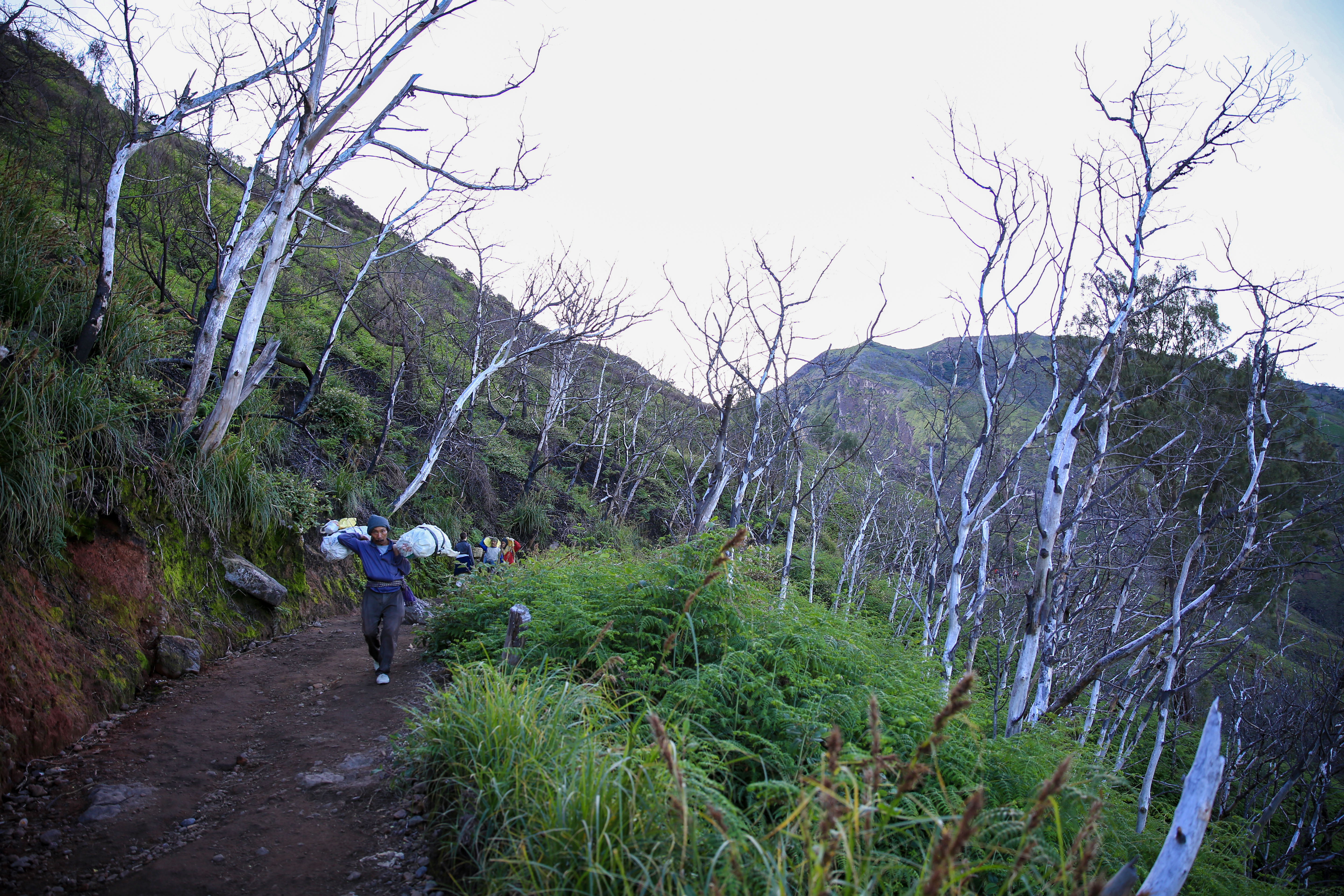 인도네시아 동부 자바섬에 있는 이젠화산 분화구에 오르기 위해