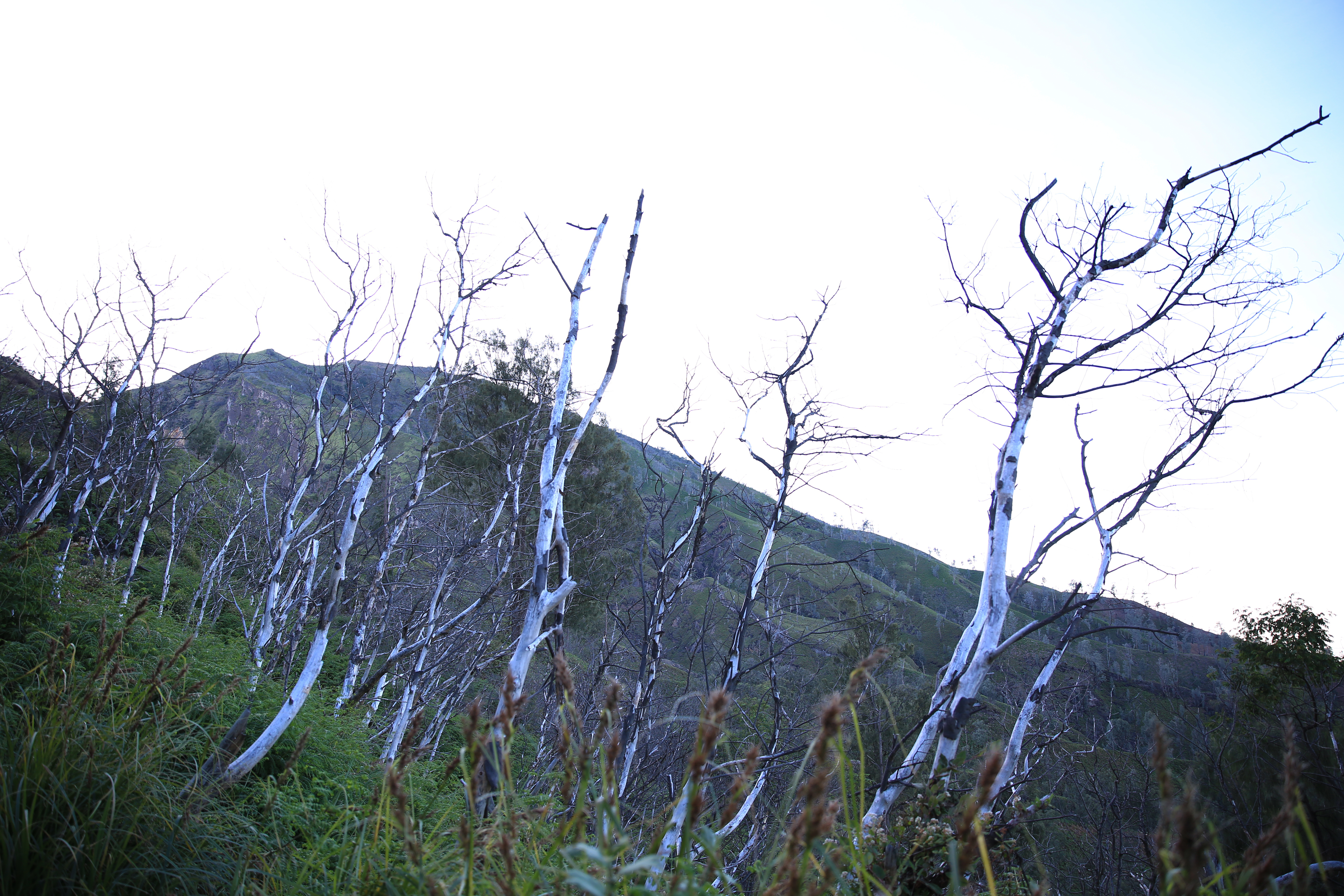 유황개스에 나무가 죽어서 흰색으로 탈색되고 정상에는 나무가 자라지 못해서 민둥산이다