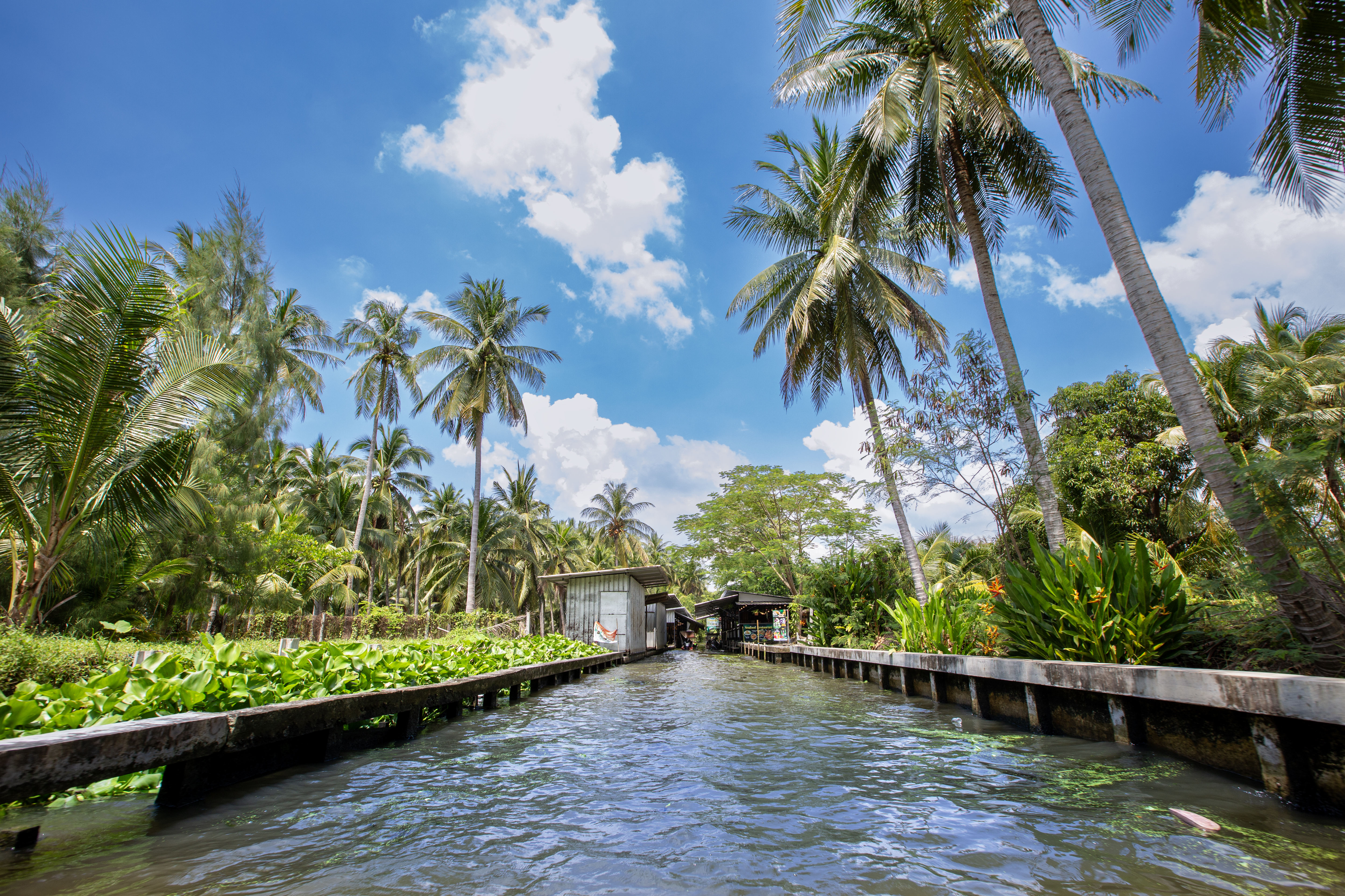 태국의 코코넛 농장을 보트를 타고 수로를 따라 가면서 구경을 한다