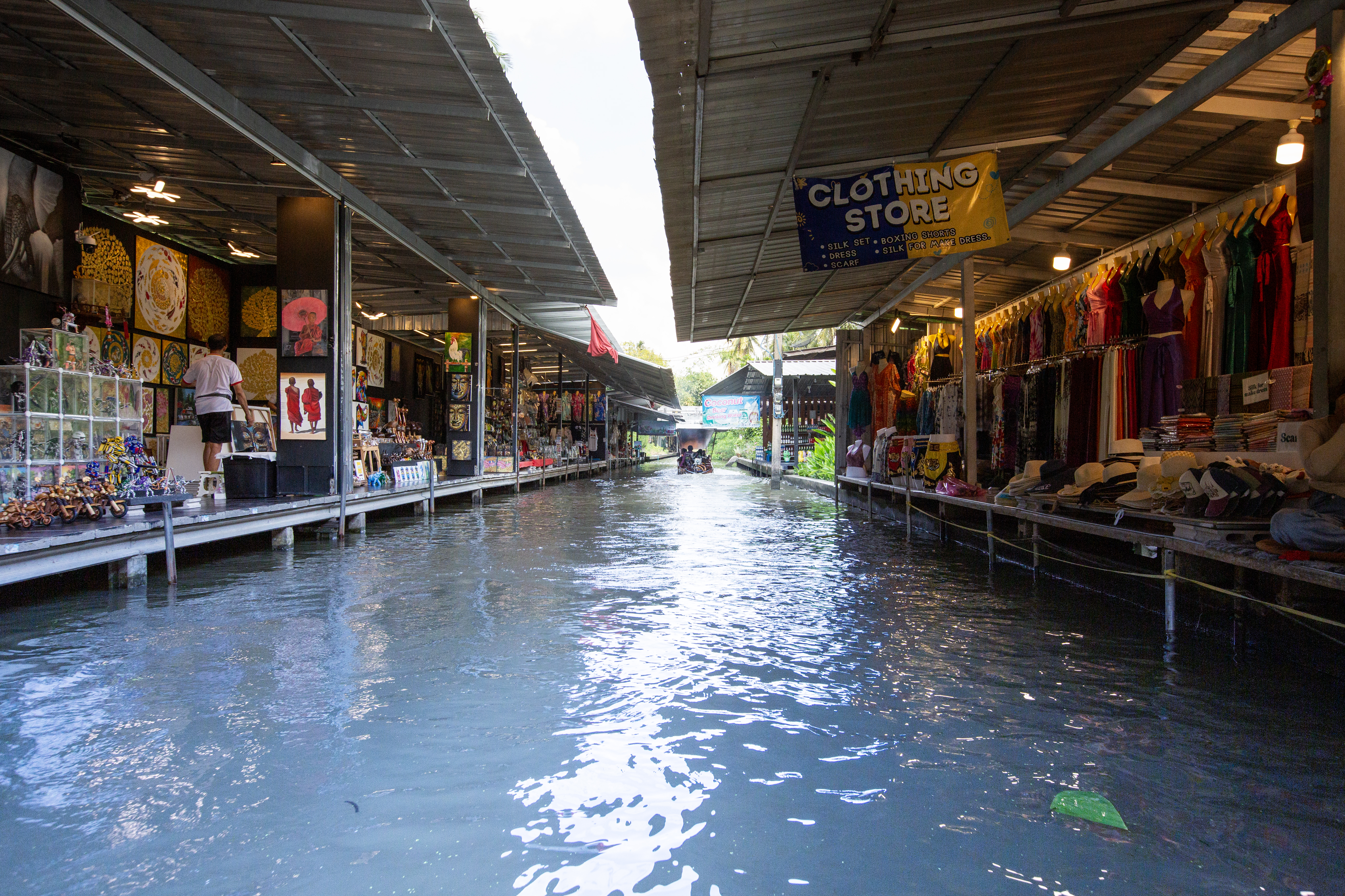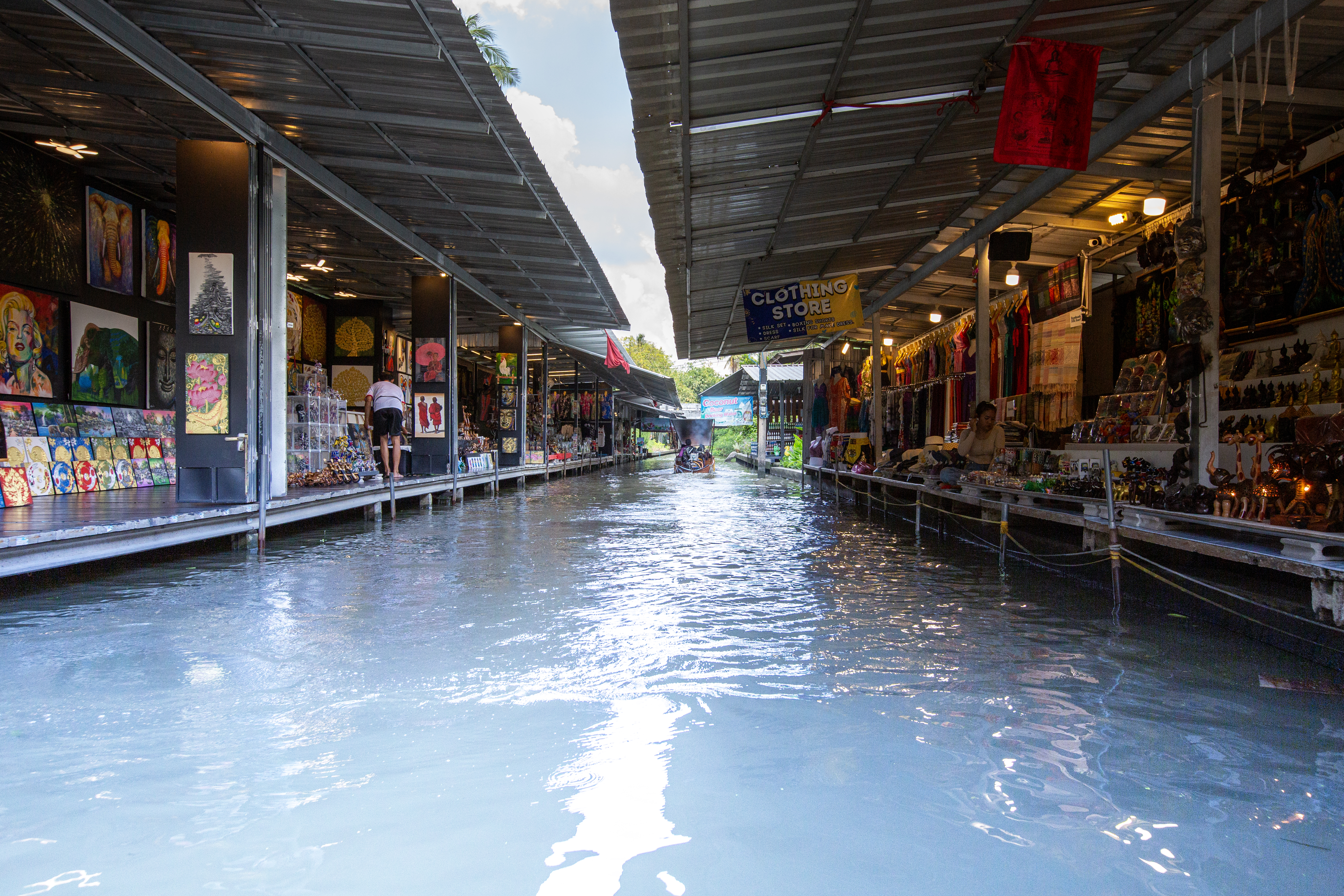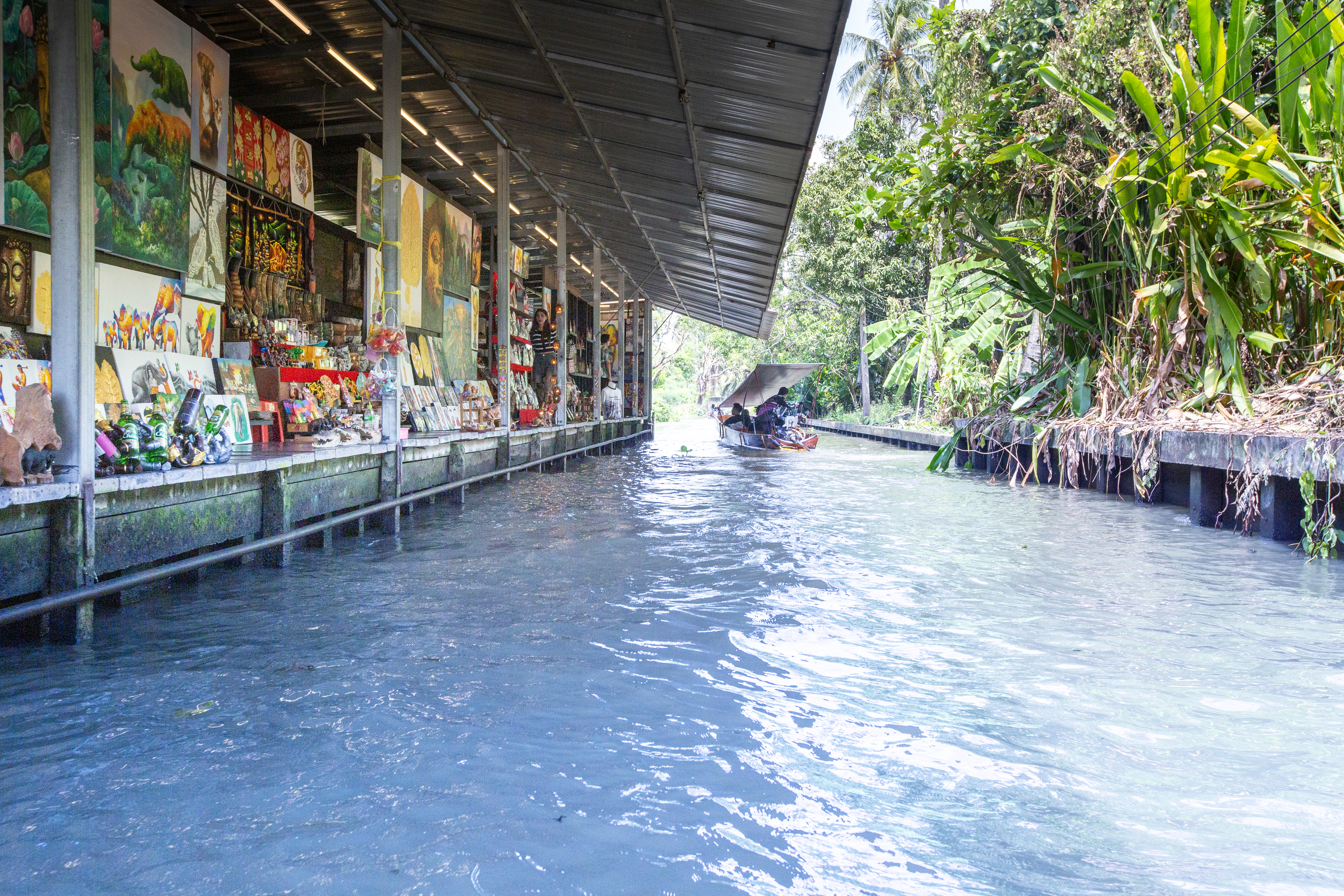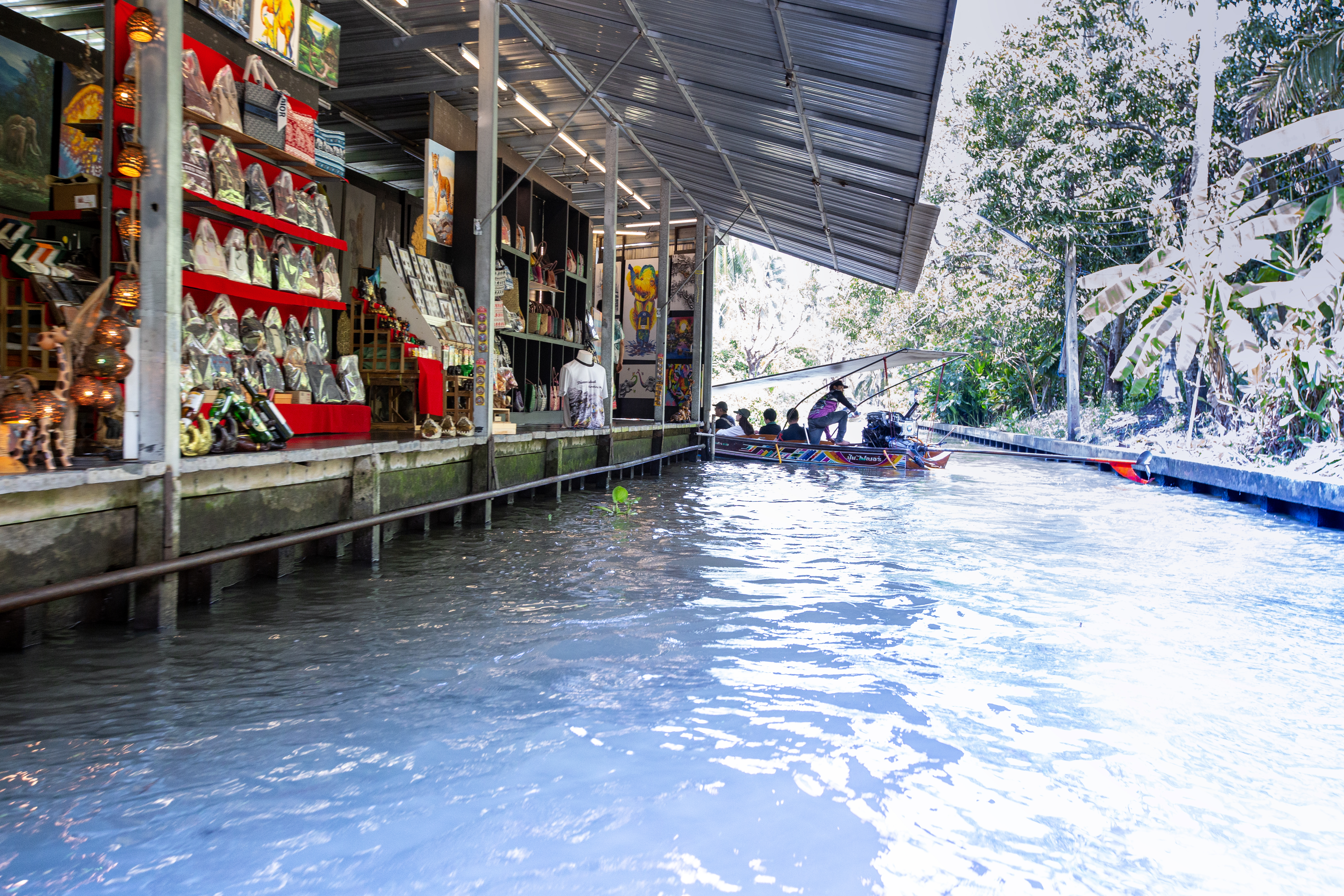 보트를 타고 수로를 따라 가면서 여러가지 물건을 파는 가게풍경을 구경하고