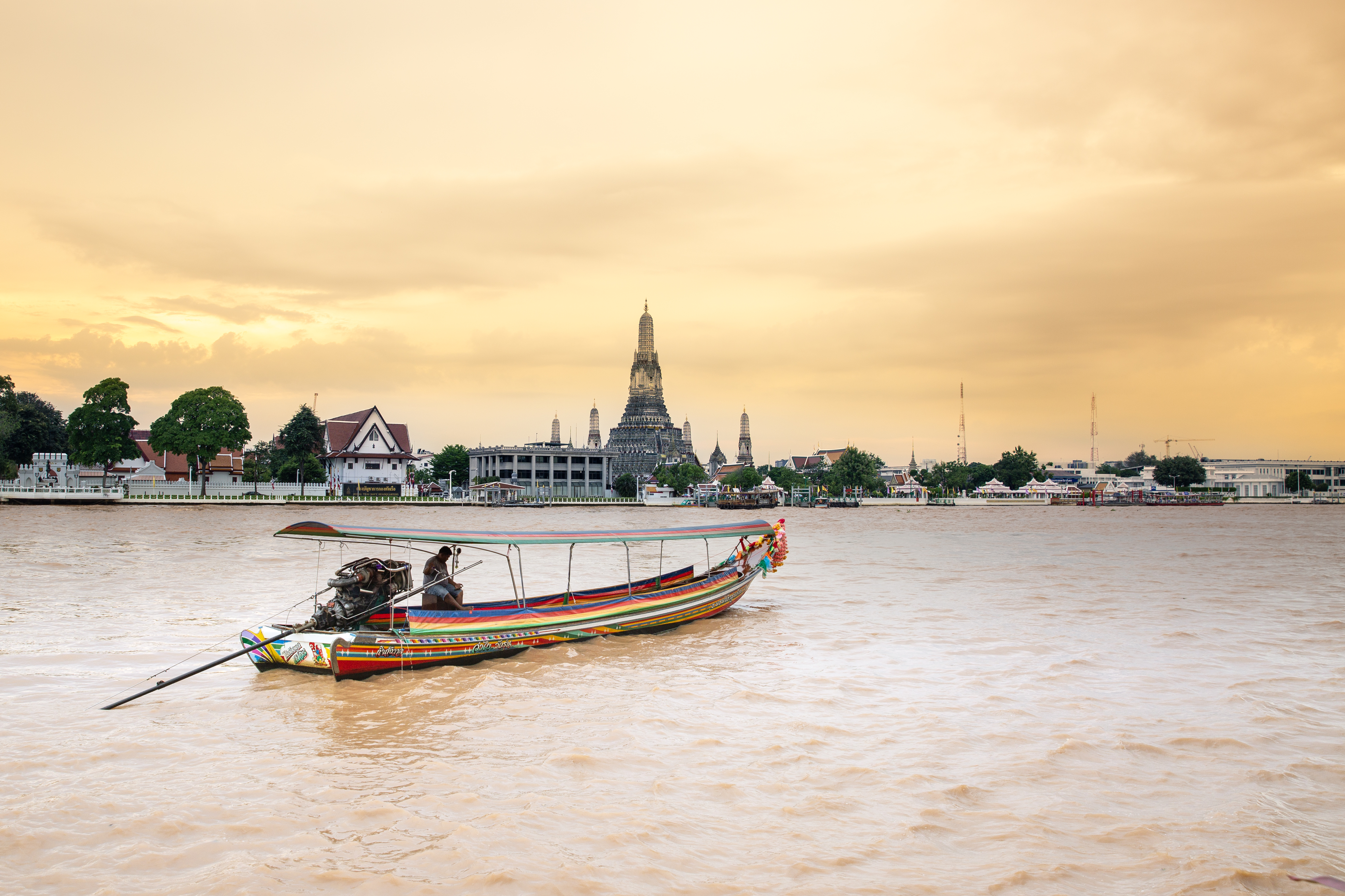 보트를 타고 방콕의 어머니 강 짜오프라야를 따라 흘러간다